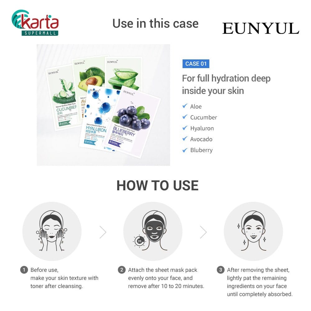 1. The EUNYUL mask sheet helps to boost skin hydration and texture. Before applying the mask sheet, kindly apply the toner first after washing your face with a cleanser to remove any traces of make-up and  impurities.