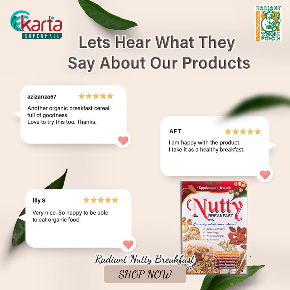 Radiant Nutty Breakfast is a crunchy wholesome choice! It has whole oats, sunflower kernels, and sesame seeds. Made delicious with natural whole nuts like almond, cashew nut, and hazelnuts. Great for nuts lovers! It contains fiber, complex carbohydrates, protein, vitamin C, and minerals like calcium, potassium, and iron.