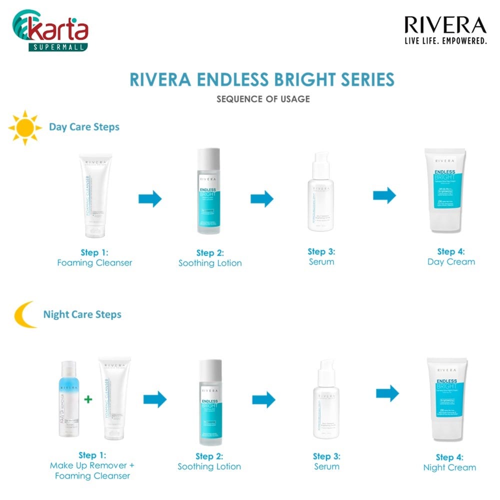 Wash your face, take 2-3 drops of the serum and apply evenly on the face and neck. Gently massage the applied area(s) for around 5 minutes until the serum successfully penetrates into the skin. For optimum result, apply Rivera Endless Bright Fairness Glow Day Cream for daytime routine and Rivera Endless Bright Fairness Glow Night Cream for night time routine after applying the serum.
