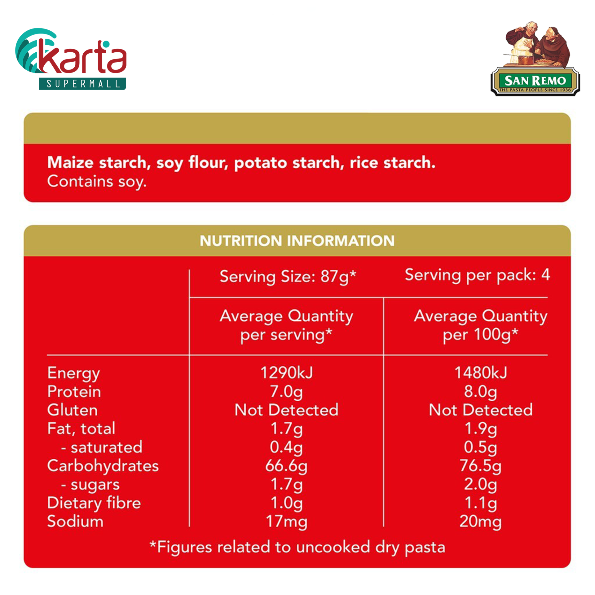 San Remo Gluten Free pasta is ideal for anyone following gluten-free lifestyle. San Remo Gluten Free range also available in Spaghetti and Lasagna.